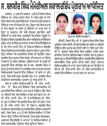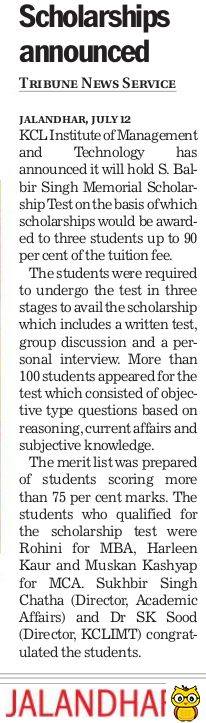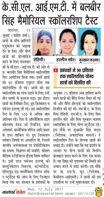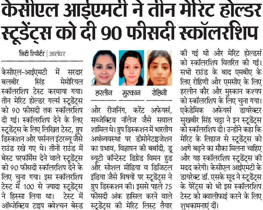• Media Coverage for S.Balbir Singh Memorial Scholarship Test held at KCL-IMT
