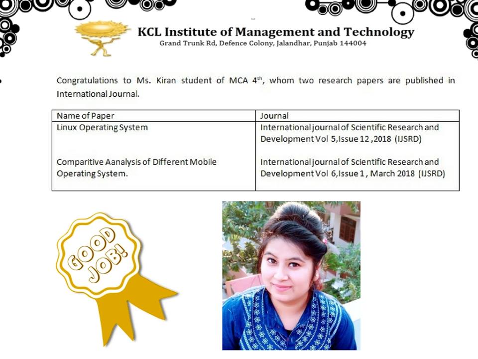 Jasleen kaur, Ashfa sadaf Students of MCA(IV Sem) #KCL-IMT presented a Research Paper on ”Artificial Intelligence & Knowledge Based System” at Panjab University Constituent College,Patto Hira Singh,Nihal Singh wala(Moga) on 3-feb-2018. Research Co-ordinator:- Dr. Inderpal singh & Prof. Read more